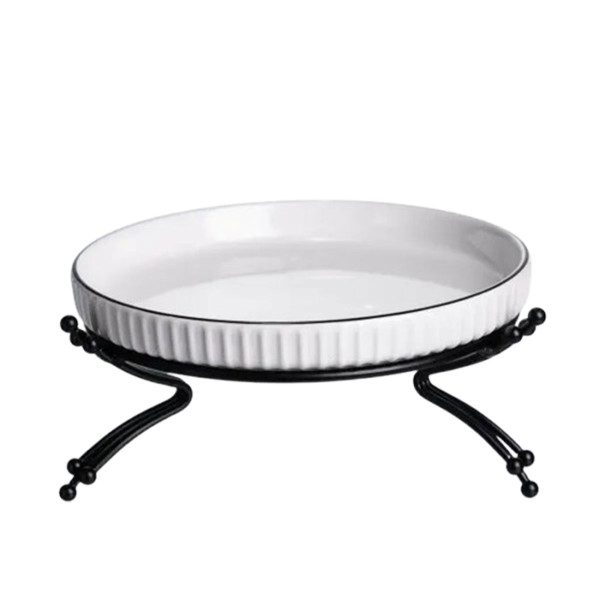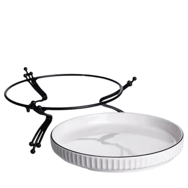 Елегантне порцелянове блюдо на металевій підставці - ідеальне рішення для подачі десертів, закусок та фруктів. Воно поєднує короткий скандинавський дизайн та практичність. Якісне глазуроване покриття легко чиститься та не вбирає запахи, а міцна підставка з металу забезпечує стійкість. Оптимальні розміри роблять виріб ідеальним для порційних десертів, міні-тартів, закусок чи подачі соусів та дипів. Підставка піднімає страву над поверхнею, що вигідно підкреслює презентацію страв та захищає поверхню столу.