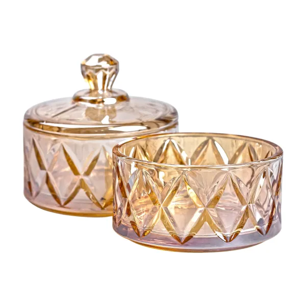 Цукерниця трирівнева зі скляною кришкою має висоту 15 см і діаметр 10 см. Виготовлена зі скла, стилізованого під кришталь, що забезпечує ефектний вигляд завдяки грі світла на рельєфній поверхні. Конструкція складається з трьох рівнів, що дозволяє зручно розміщувати різні види солодощів або дрібних закусок.