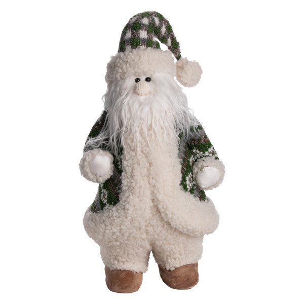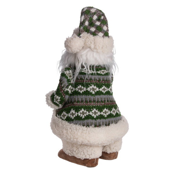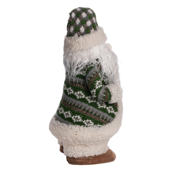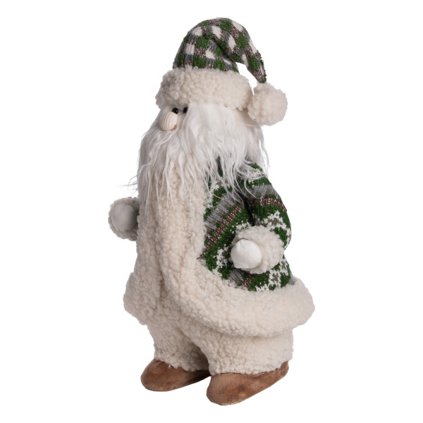 Фігурка виконана з м’яких текстильних матеріалів, що створюють затишний зимовий образ. Santa одягнений у зелене пальто пальто з пухнастою фактурою та білим орнаментом. Ковпак виконаний у зелено-білій гамі з помпоном. Вага 200 г забезпечує стабільність при встановленні.