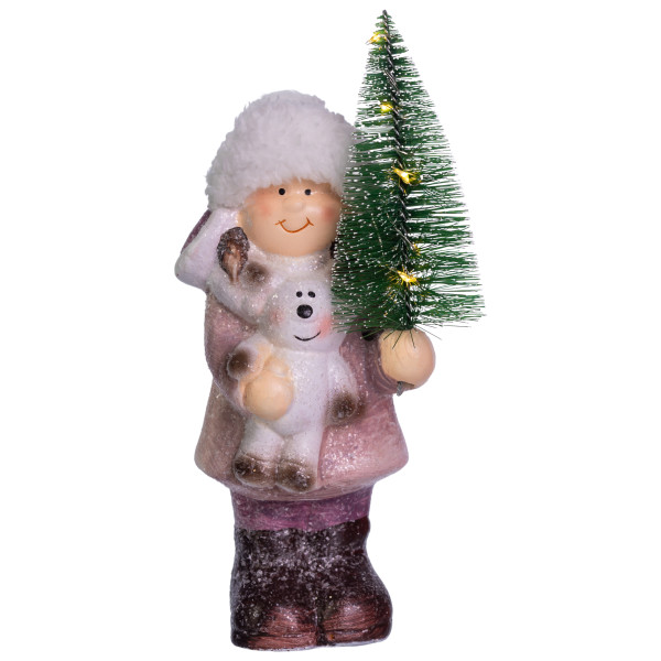 Порцелянова фігурка дівчинки з ялинкою — це зимовий декоративний елемент, що поєднує естетику та функціональність. Вона зображена у рожевому пальті з білим хутром, темних чобітках і пухнастій шапці, тримаючи в руках маленьку зелену ялинку з теплими жовтими вогниками та білого ведмедика. Поверхня фігурки має легкий блиск і покрита штучним снігом, що підсилює святкову атмосферу.