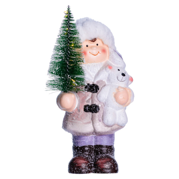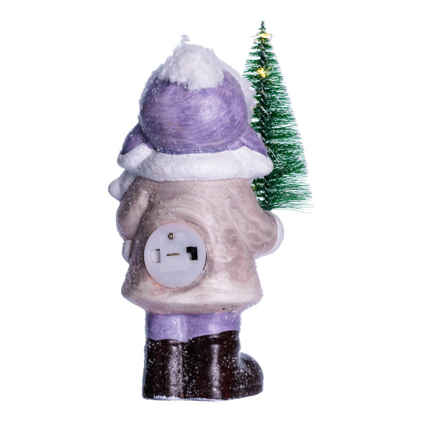 Фігурка зображує дівчинку в білому пальті з чорними ґудзиками, білому капелюсі з вушками, фіолетових штанах і коричневих черевиках. В руках — зелена ялинка та біла іграшка. Поверхня фігурки має легкий ефект засніженості, а вбудована підсвітка створює тепле світіння, підкреслюючи деталі оздоблення. Матеріал — порцеляна, вага — 300 г, що забезпечує легкість і стабільність.