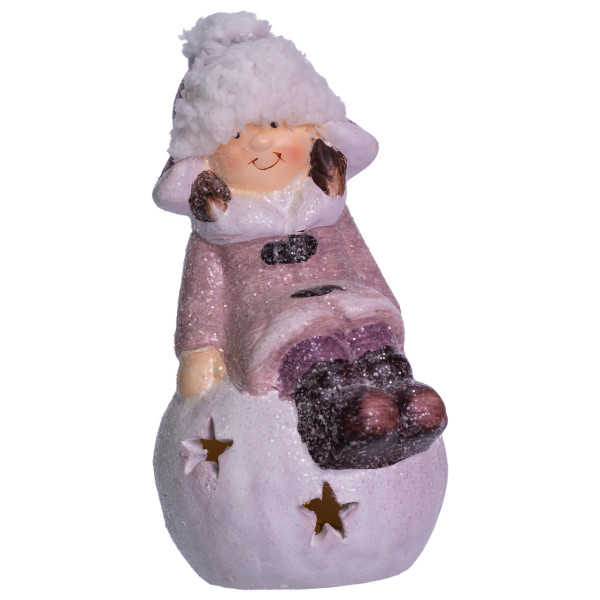 Ця порцелянова фігурка зображує дівчинку, що сидить на сніжній кулі, створюючи затишну зимову сцену. Вона одягнена в рожеве пальто з білим хутром, темні чобітки та пухнасту шапку. Її обличчя усміхнене, очі заплющені, а щоки — рум’яні, що додає образу тепла й спокою.