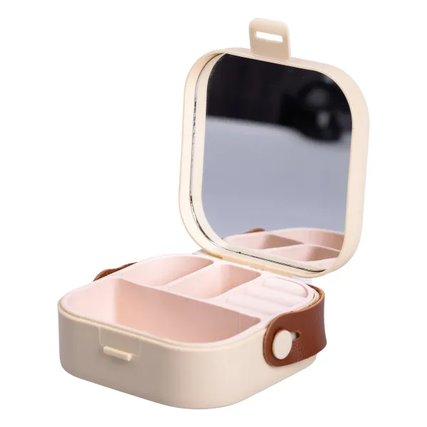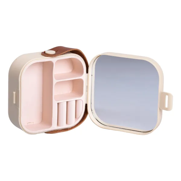 Футляр має один ярус із чотирма окремими відсіками, що дозволяє організовано розмістити каблучки, сережки, ланцюжки чи браслети. У кришці вбудовано дзеркальце, яке дозволяє швидко приміряти аксесуари або скоригувати образ будь-де.