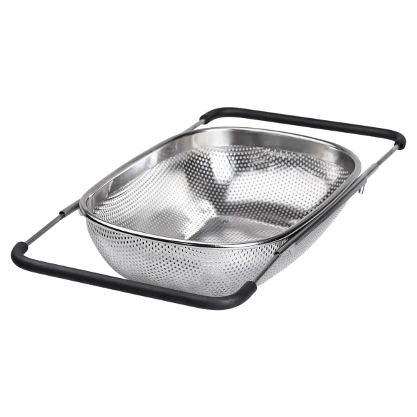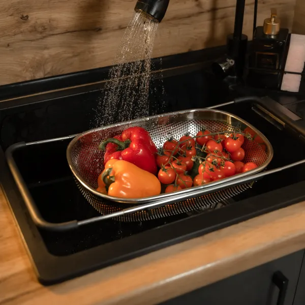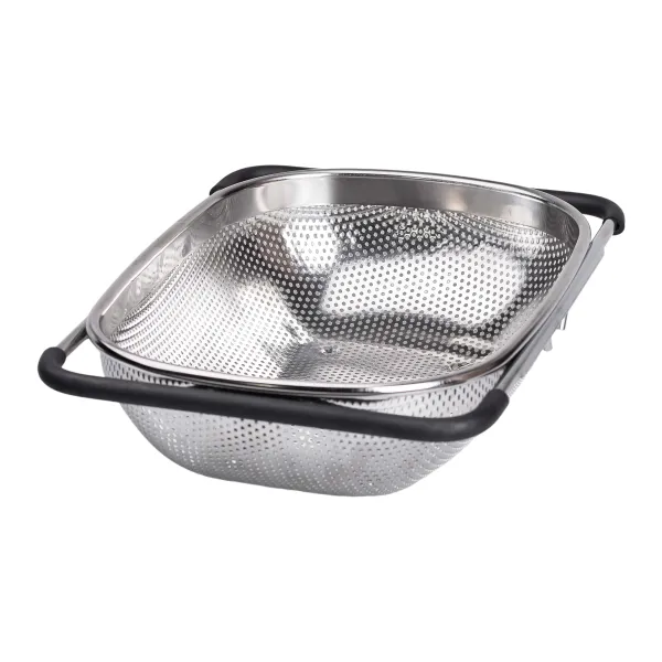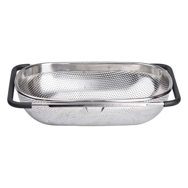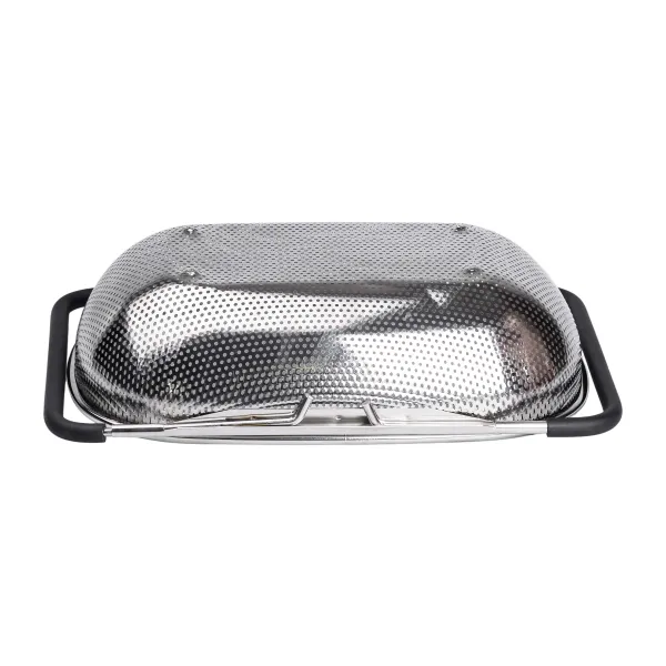 Особливістю моделі є телескопічні ручки, які легко розсуваються, адаптуючи друшляк до різних розмірів раковини. Вони оснащені ПВХ-накладками, що запобігають ковзанню і забезпечують зручність у використанні. Така конструкція дозволяє надійно закріпити сито над раковиною, звільняючи руки під час роботи, що особливо корисно при великих обсягах промивання продуктів.