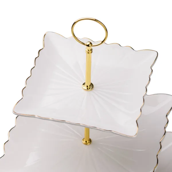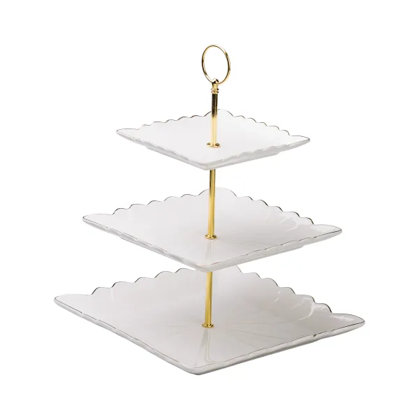 Конструкція з металевою ніжкою забезпечує міцність і стійкість виробу, що робить його практичним для повсякденного та святкового використання. На трьох ярусах розташовані квадратні тарілки розміром 25 см, 21 см та 15 см, що надає простір для сервірування різноманітних смаколиків. Це дозволяє зручно організувати десерти або фрукти за категоріями та створити охайний вигляд столу.