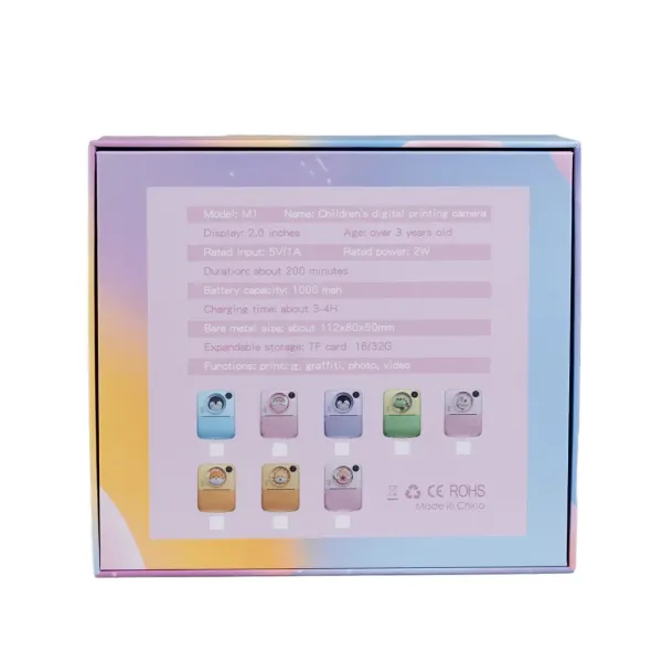 Фотокамера має 2 об'єктиви для знімків і відео з роздільною здатністю 1920*1080px. Встановлені ігри дадуть можливість юному фотографу не нудьгувати у перервах між створенням перших своїх шедеврів. При цьому вбудований принтер і термопапір для друку дозволяють друкувати фотографії прямо як чеки в супермаркеті.