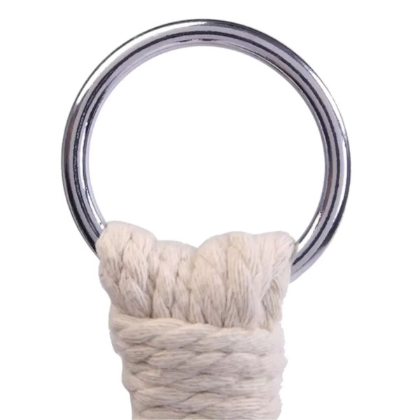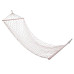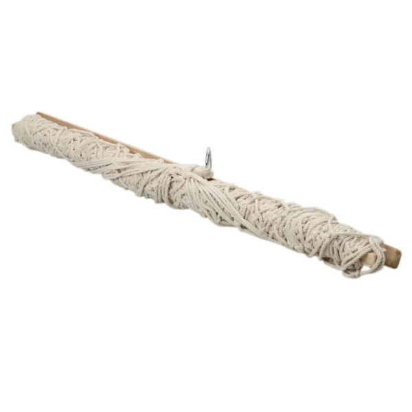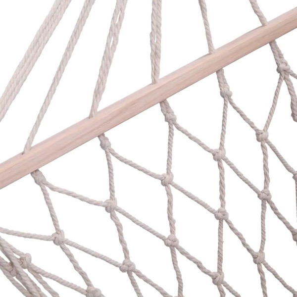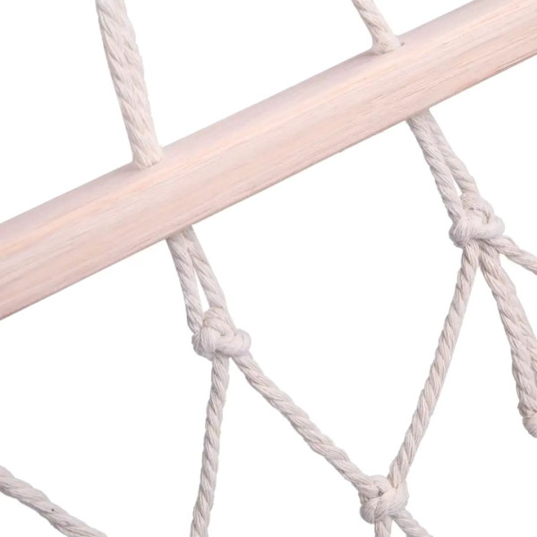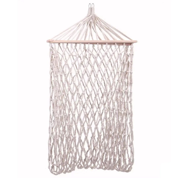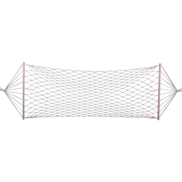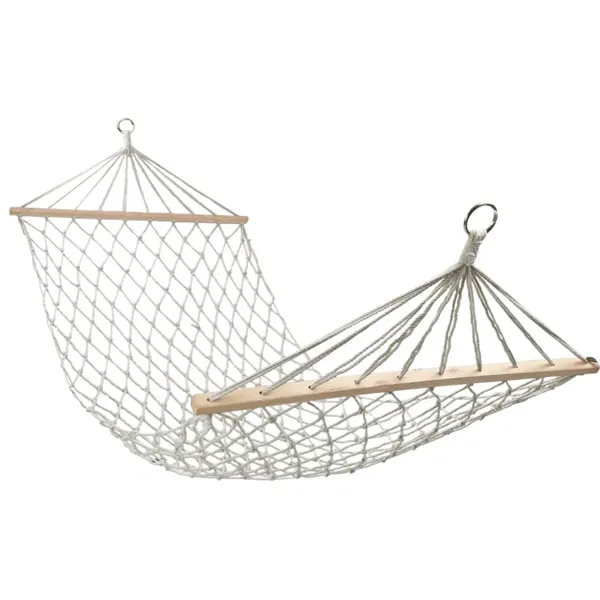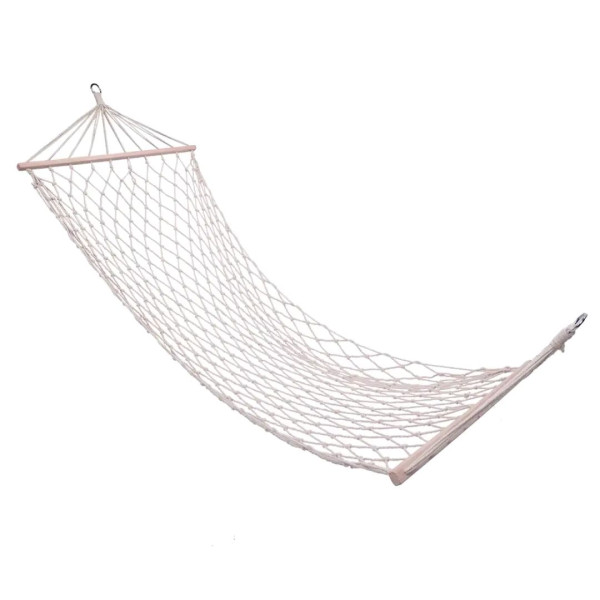 Класичний гамак із дерев’яними поперечинами підходить для відпочинку в саду, на дачі, під час виїздів на природу або кемпінгу. Ложе виконане з бавовняної мотузки з сітчастим плетінням, що забезпечує добру вентиляцію та не створює тиску на тіло під час лежання. Завдяки натуральному матеріалу гамак приємний на дотик, не викликає подразнень і підходить для тривалого використання.