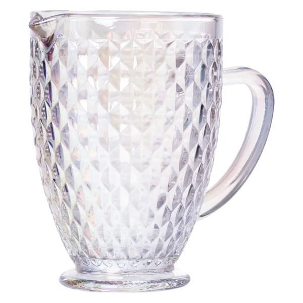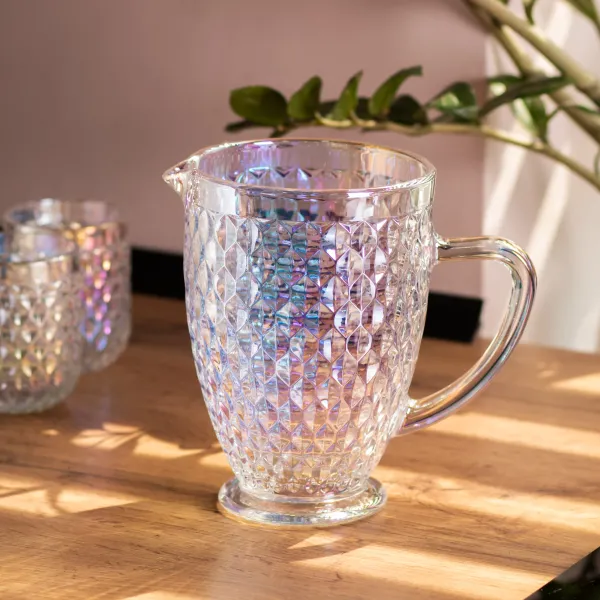 Глечик для напоїв з рельєфною поверхнею призначений для зберігання та подачі холодних або кімнатної температури рідин: води, соків, компотів. Завдяки простій формі та стійкій основі його зручно використовувати як у побуті, так і в громадських закладах. Прозоре скло дозволяє бачити вміст, що додає зручності в повсякденному використанні.