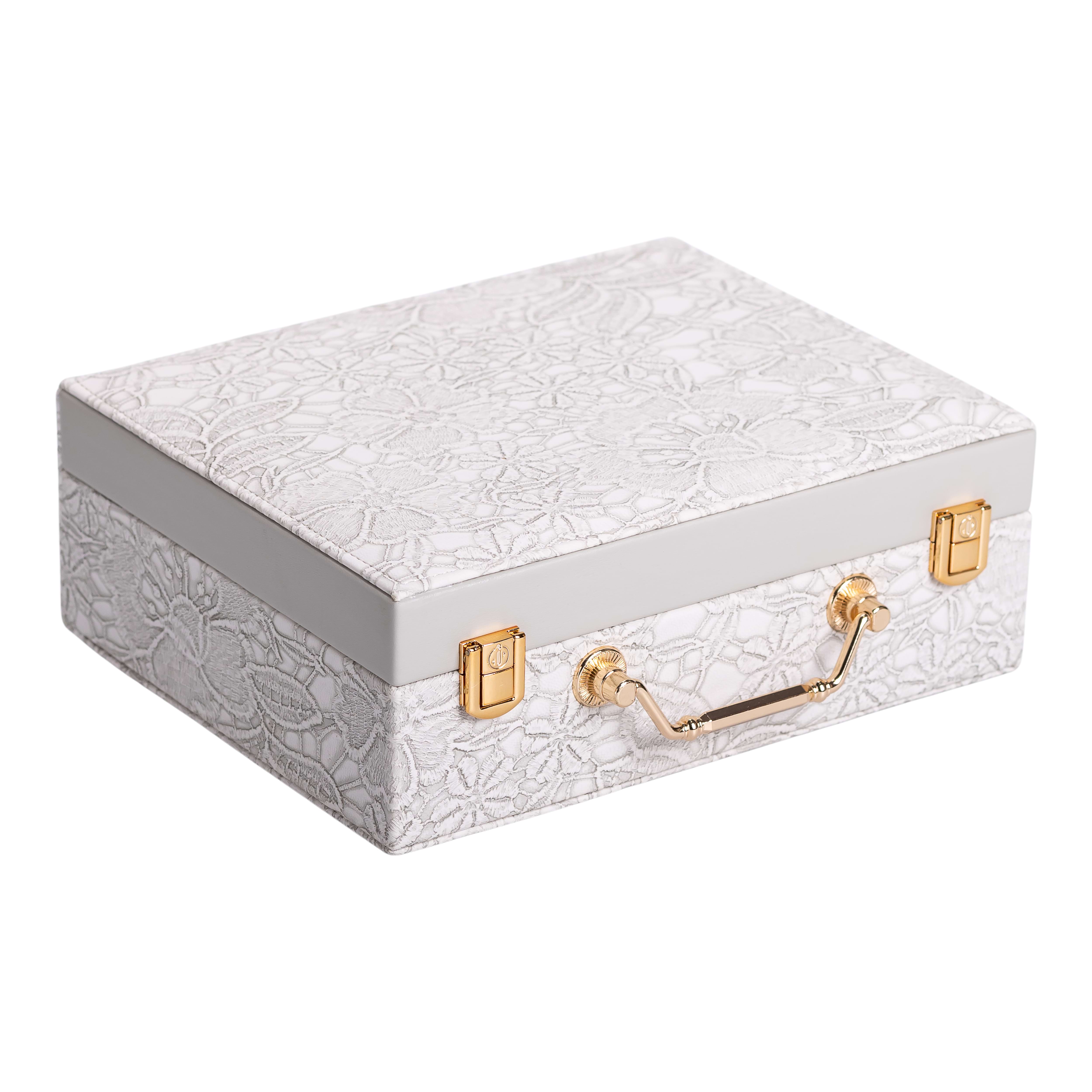Валіза має 19 відсіків, різної конфігурації, які дозволяють упорядкувати каблучки, браслети, ланцюжки та інші прикраси з дорогоцінних, напівдорогоцінних металів, біжутерію. Внутрішнє оздоблення виконане з велюру і відмінно підходить для перлів, каміння, синтетичних вставок.