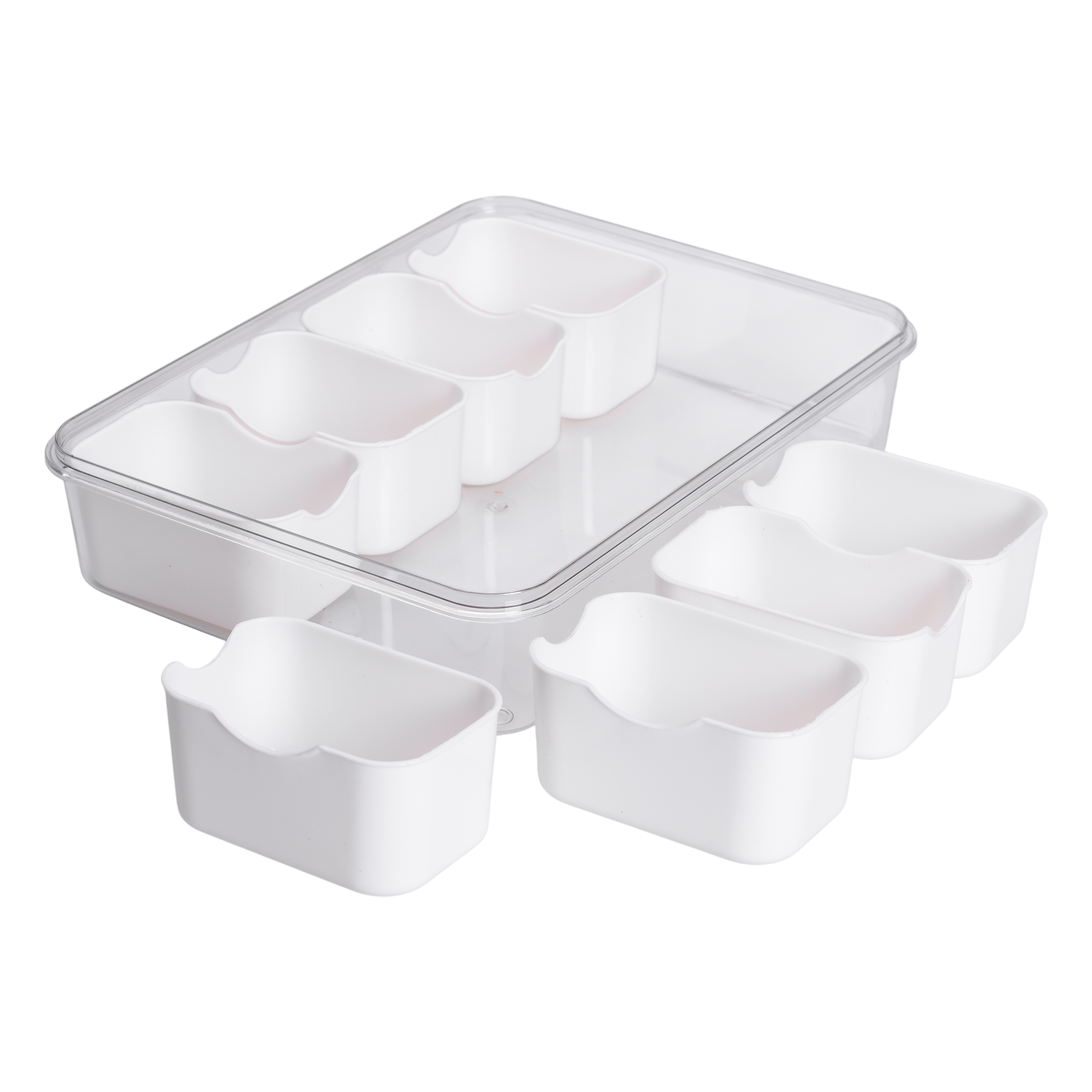 Прозорий пластиковий контейнер прямокутної форми призначений для організованого зберігання невеликих порцій продуктів. Усередині розміщено 8 окремих білих пластикових відсіків, кожен з яких має об’єм 250 мілілітрів. Відсіки знімні, що дозволяє використовувати їх окремо. Завдяки компактним розмірам відсіків можна ефективно розміщувати дрібні інгредієнти без змішування.