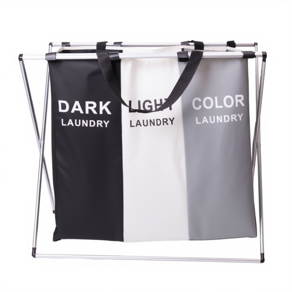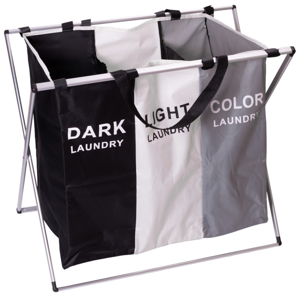 Текстильний кошик для білизни на 3 секції забезпечує зручне сортування одягу перед пранням. Завдяки розділам для темної, світлої та кольорової білизни процес підготовки речей стає організованішим. Міцний металевий каркас підтримує форму та надає стійкість конструкції.