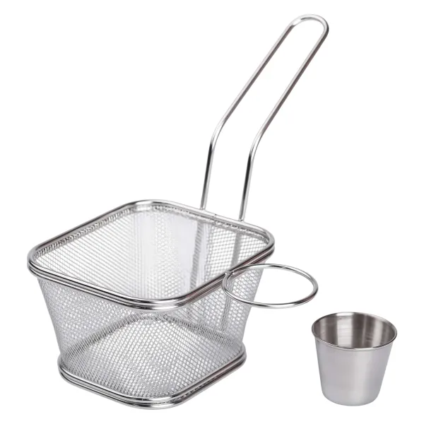 Сервірувальний кошик - зручний аксесуар для подачі гарнірів і закусок. Він ідеально підходить для картоплі фрі, курячих наггетсів, цибулевих кілець, креветок та інших страв, приготованих у фритюрі. У комплект входить соусник, що дає змогу подавати сметану, вершки, густі соуси або доповнювати страви оливками та іншими добавками.