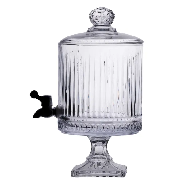 Модель встановлена на квадратній скляній ніжці розміром 12×12 см, що забезпечує стійкість і візуальне відокремлення лимонадниці від поверхні. Її висота разом із кришкою становить 39 см, без кришки — 31 см, а діаметр верхньої частини — 20 см. Скляна кришка щільно закриває лимонадницю, запобігаючи потраплянню пилу або комах. Краник виготовлено з пластику — він дозволяє легко розливати напій.