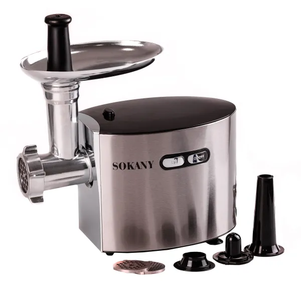 Електрична м'ясорубка Sokany SK-091 - незамінний пристрій на будь-якій кухні. М'ясорубка відрізняється оптимальною потужністю для переробки великої кількості продуктів за короткий час. Конструкцією передбачено режим реверсу і три змінні решітки, завдяки чому можна обробляти сировину різної твердості і текстури без втрати зайвих зусиль. При цьому, в комплекті поставляються насадки для ковбасок і кеббе, що дає можливість виготовляти напівфабрикати і заготовки для найрізноманітніших страв.
