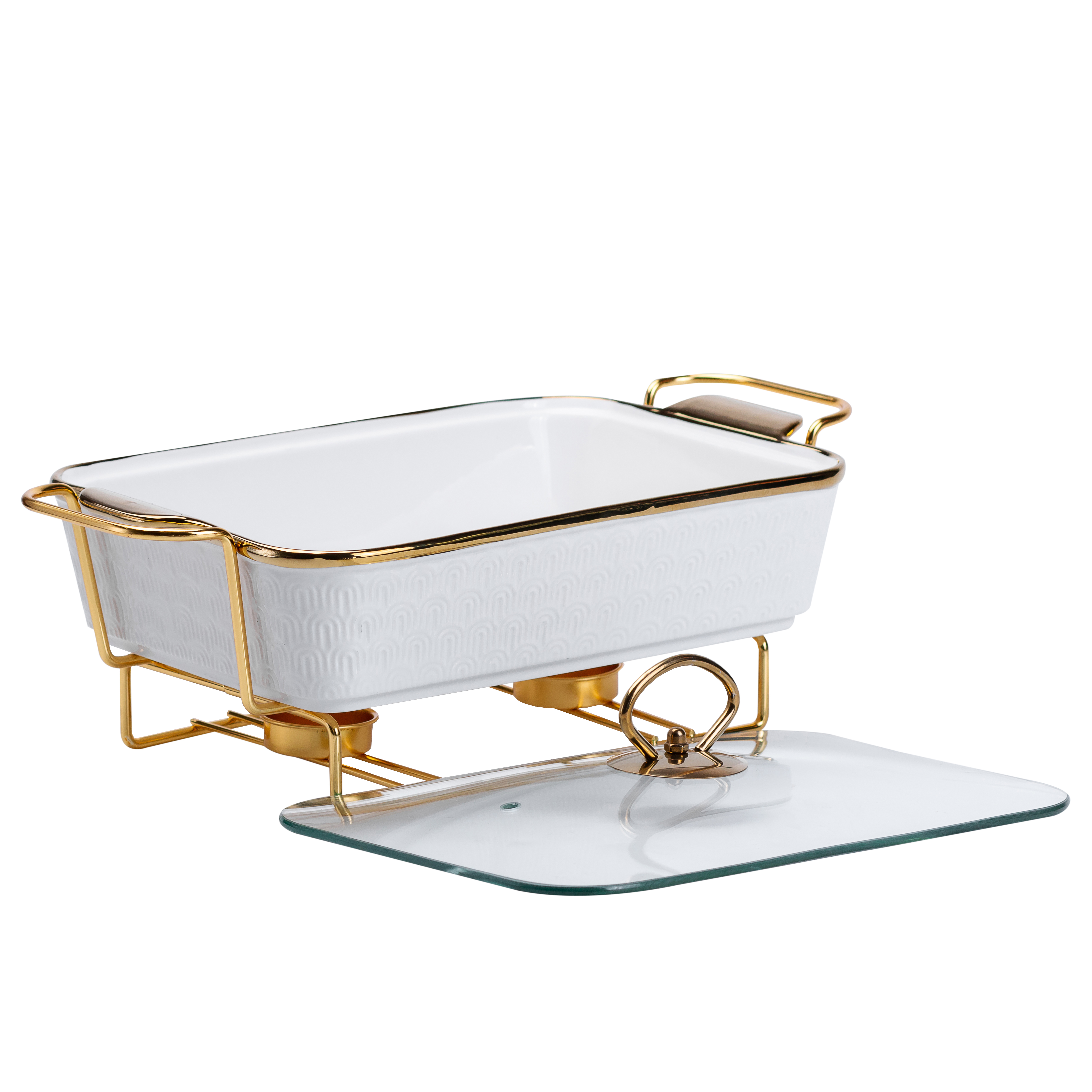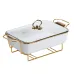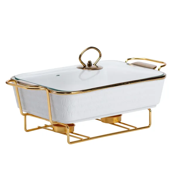 Корпус виготовлений із порцеляни – матеріалу, який добре зберігає тепло і не впливає на смак страв. Металева підставка виконує функцію тримача, що дозволяє розмістити ємність на столі з мінімальним ризиком перекидання. Завдяки універсальному дизайну, виріб доречно виглядає в різних інтер’єрах – від класичної сервіровки до сучасного стилю.