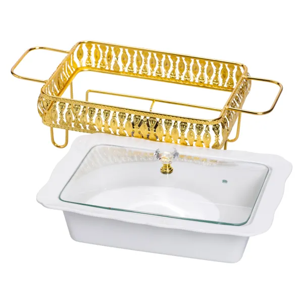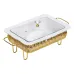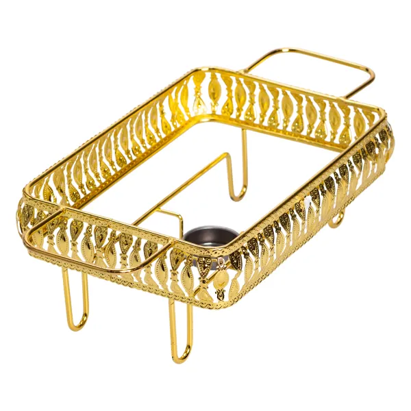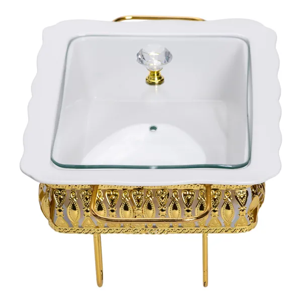 Конструкція передбачає металеву підставку золотистого кольору, яка не лише додає виробу стійкості, а й робить його стильним елементом сервірування. У підставці передбачене місце для підігріву за допомогою свічки-таблетки, що дозволяє підтримувати температуру страв протягом усього застілля. Такий формат стане зручним як для домашніх свят, так і для невеликих фуршетів.