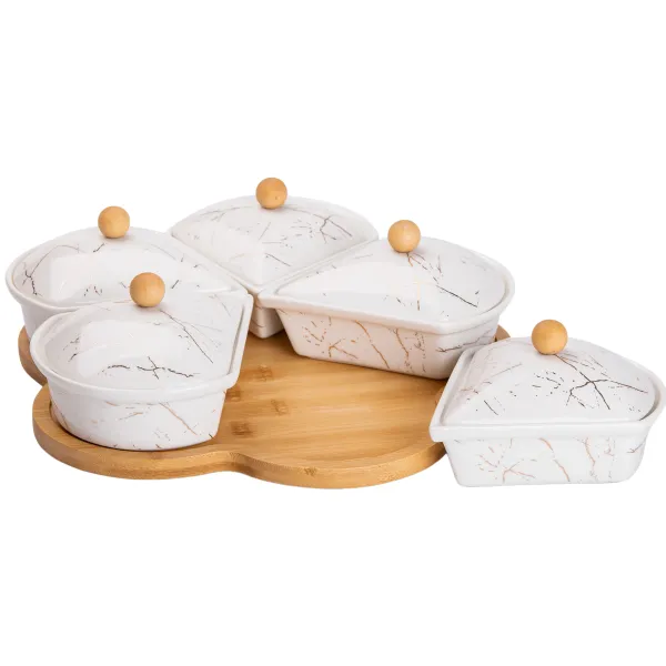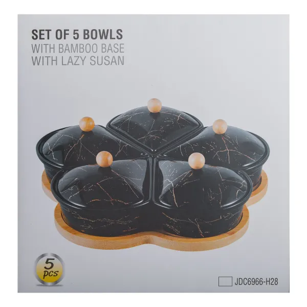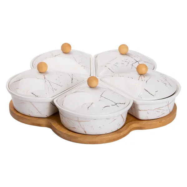 Менажниця виготовлена з якісних матеріалів, бамбукова підставка обертається, що забезпечує зручність використання.