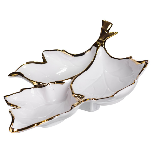 Кожна секція має об’єм 200 мл, що дозволяє подавати як рідкі, так і сипучі продукти. Виріб має плавні контури, глянцеву порцелянову поверхню та декоративне оздоблення, яке може включати золотисті акценти по краях або центральних лініях. Висота 7.5 см забезпечує зручну глибину для сервірування, а форма менажниці дозволяє легко інтегрувати її в будь-який стиль сервірування.