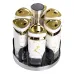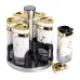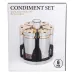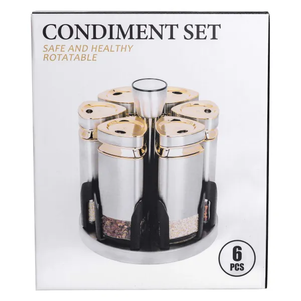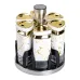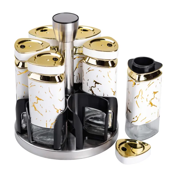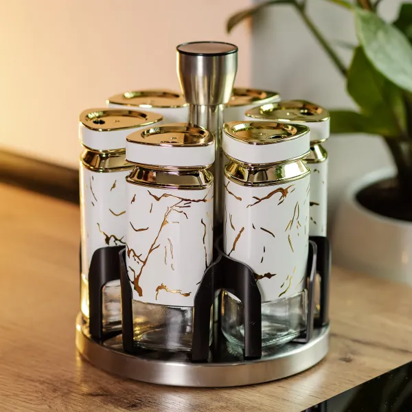 Підставка виконана з металу та пластику, має висоту 19 см і діаметр 15 см. Її конструкція забезпечує зручне вертикальне розташування баночок, економлячи місце на кухонному столі. Завдяки стильному дизайну набір стане не тільки практичним, а й декоративним елементом кухні.