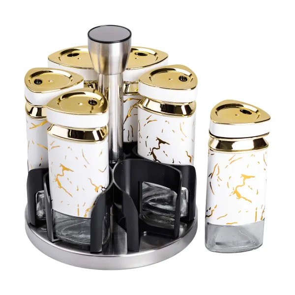Набір баночок для спецій на підставці складається з шести скляних ємностей об’ємом 120 мл. Висота кожної баночки – 12,5 см, що забезпечує достатній об’єм для зберігання різних спецій. Кришечки виготовлені з пластику з імітацією мармуру, що додає набору елегантного вигляду. Вони щільно закриваються, запобігаючи потраплянню вологи та збереженню аромату приправ.