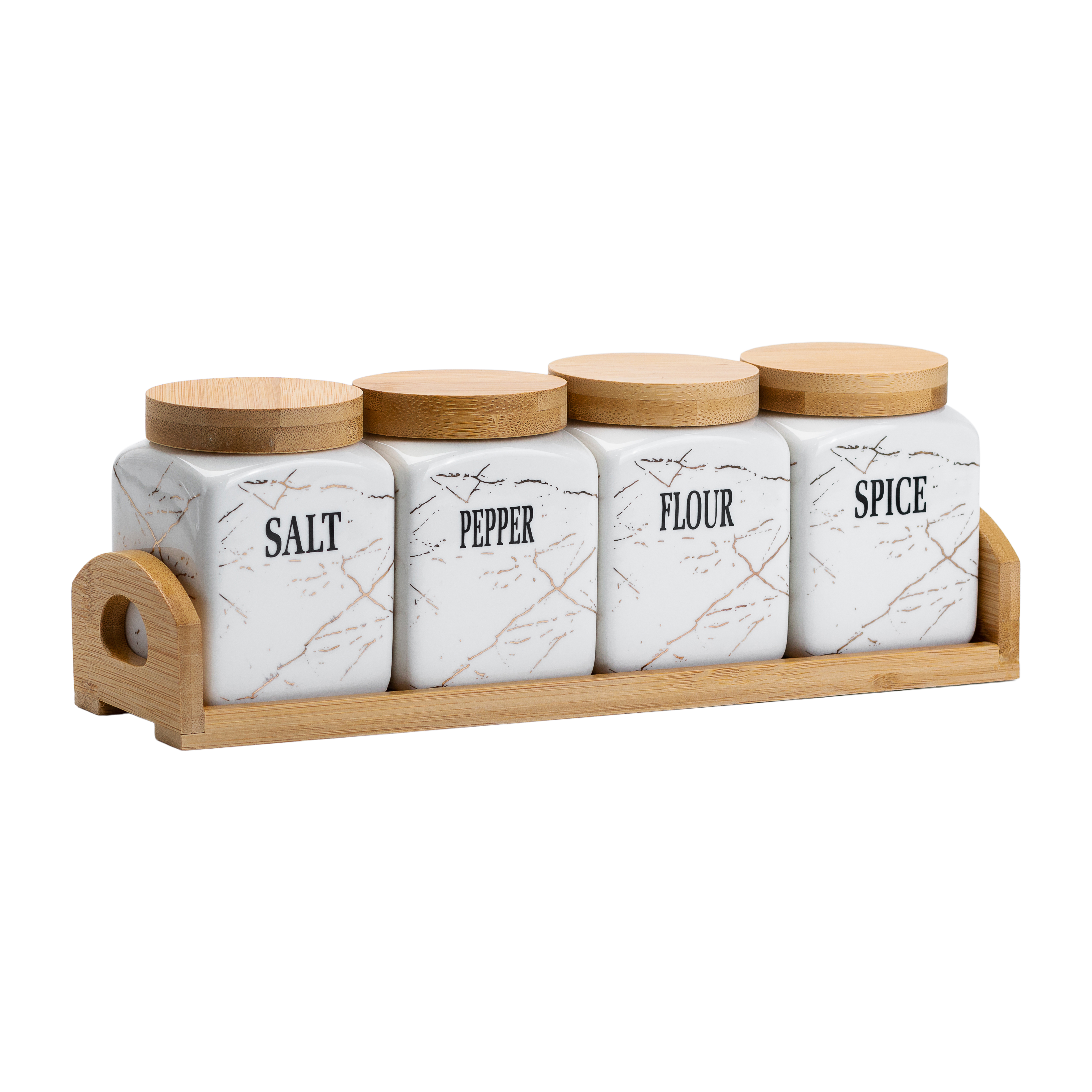 Комплект доповнюється бамбуковою підставкою, яка організовує простір на вашій кухні, роблячи банки легко доступними та акуратно розташованими. Цей набір не лише функціональний, але й естетично привабливий, підкреслюючи ваш витончений смак і увагу до деталей.