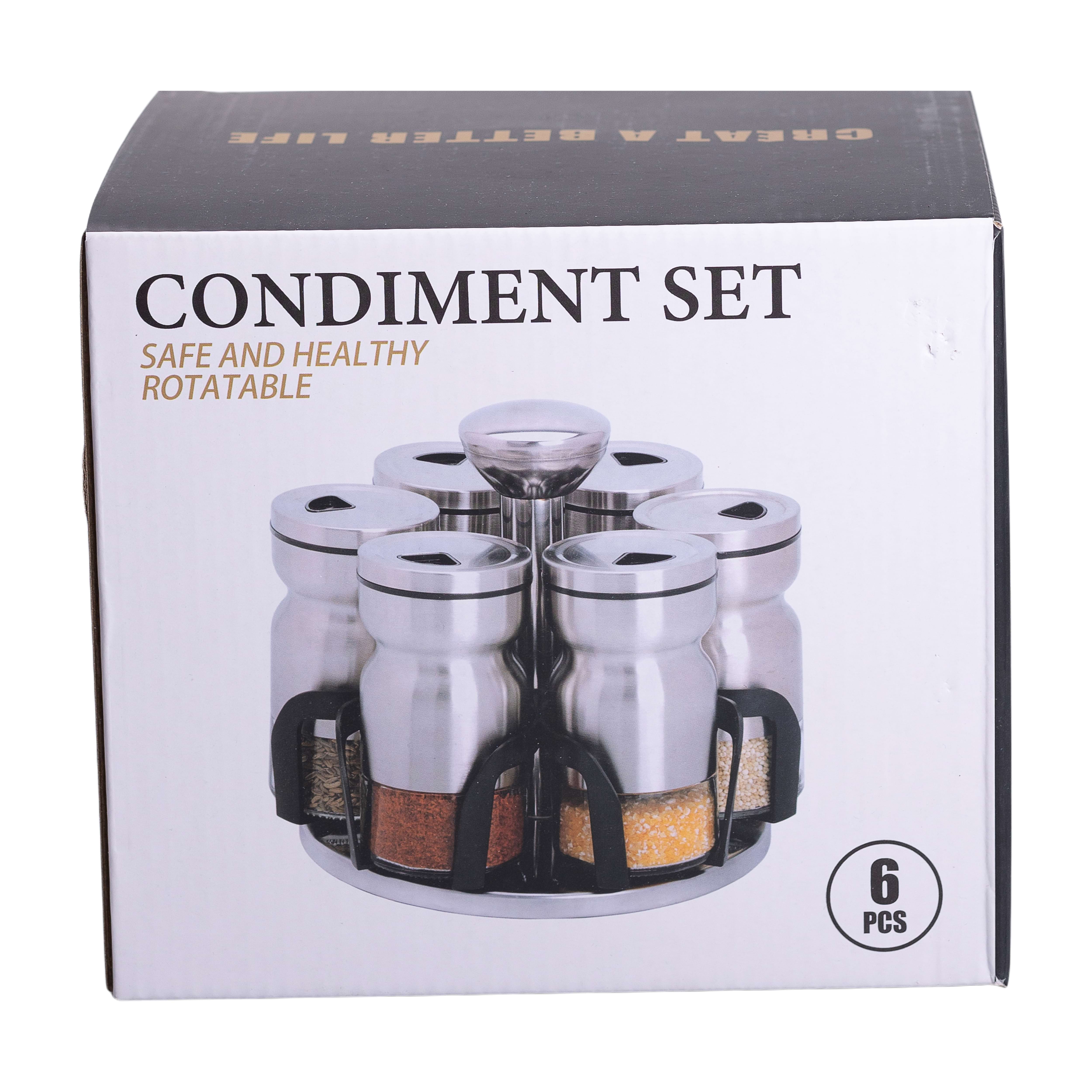 Набір для спецій на поворотній підставці включає 6 скляних баночок, кожна об'ємом 120 мл. Завдяки компактному та функціональному дизайну набір дозволяє зручно зберігати та використовувати різні спеції на кухні. Поворотна основа забезпечує легкий доступ до кожної баночки, що сприяє зручності під час приготування їжі.