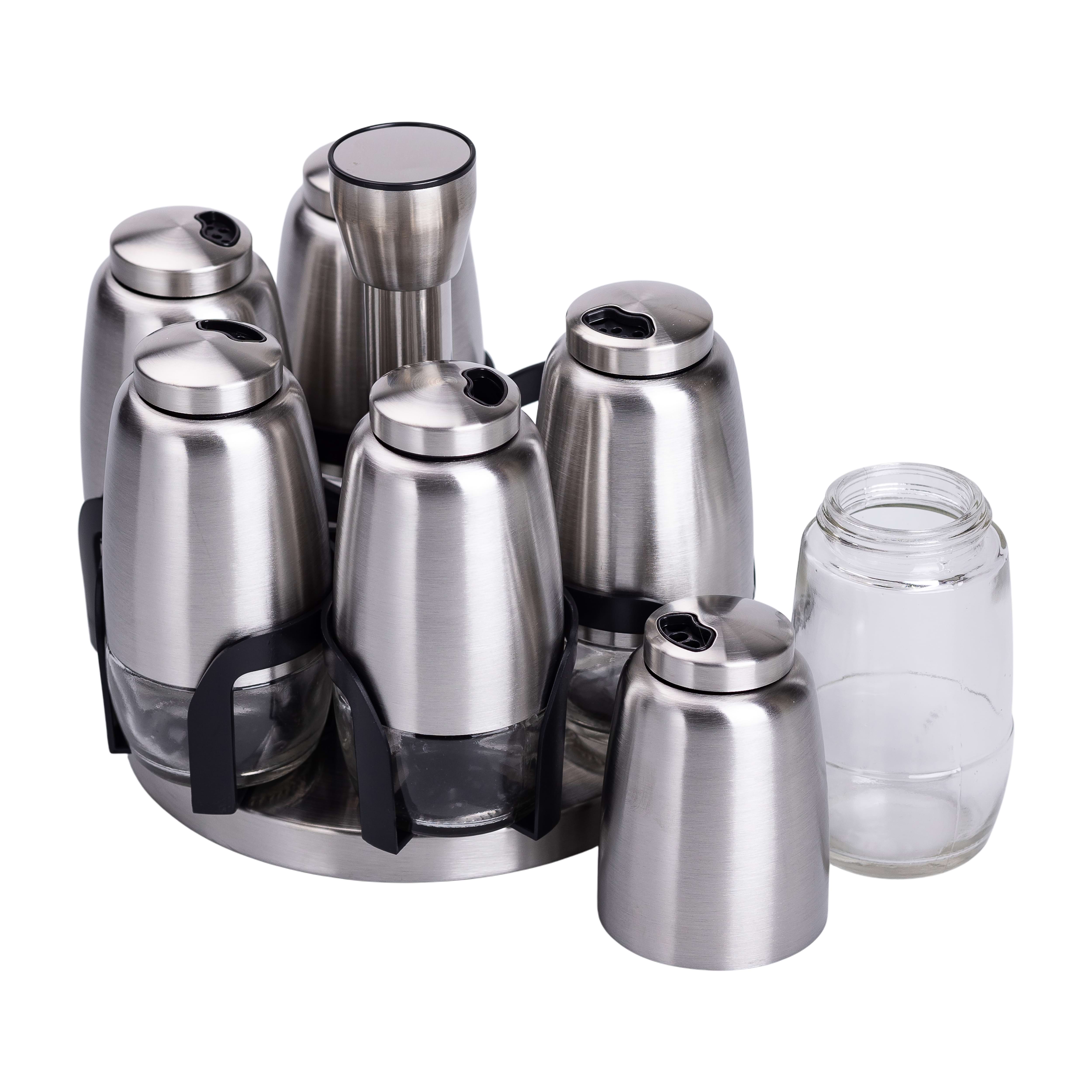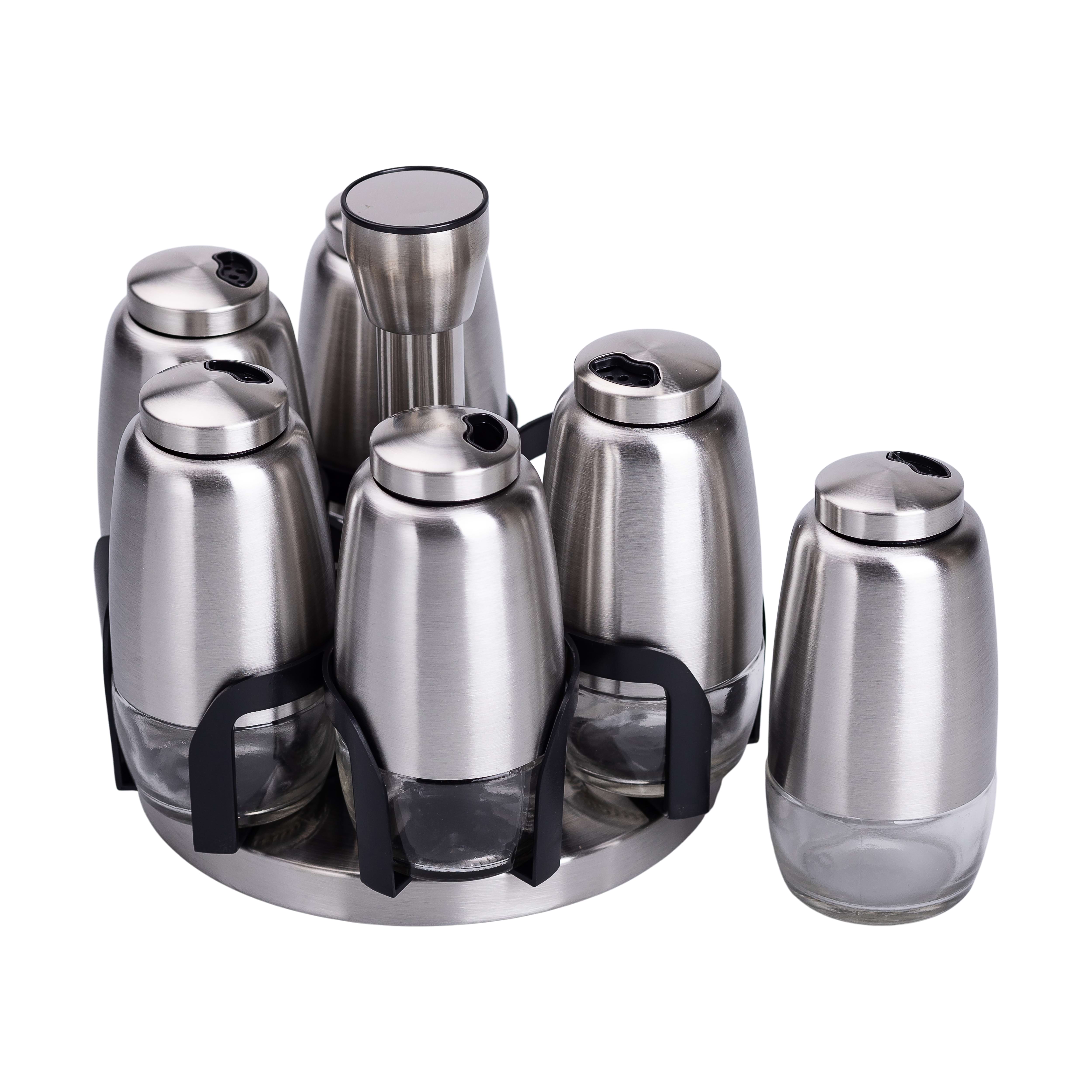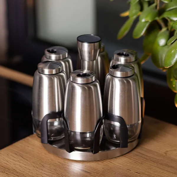 Підставка виготовлена з нержавіючої сталі та має висоту 15,5 см. Вона не тільки підтримує організоване зберігання спецій, а й додає стильного вигляду кухонному простору. Завдяки своїй конструкції набір займає мінімум місця та забезпечує порядок на кухні.