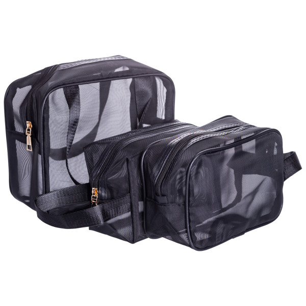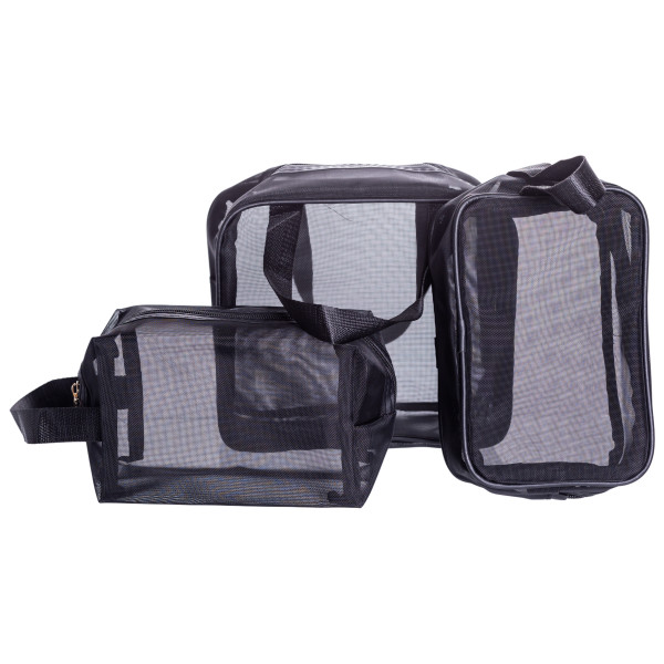Набір із трьох косметичок різних розмірів стане зручним рішенням для зберігання косметики, аксесуарів чи дрібних речей. Завдяки прозорій сітчастій структурі з ПВХ усі предмети добре видно, а легка вага робить косметички практичними для щоденного використання та подорожей.