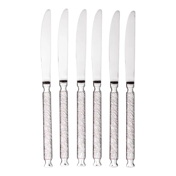 Столові ножі – невід'ємний атрибут сервірування столу. Ножі виготовлені з якісної нержавіючої сталі, мають зручну ручку з молотковою текстурою та гладке поліроване лезо. Підходять для різноманітних страв, не вимагають особливого догляду. Аксесуари можна мити вручну, або в посудомийній машині.