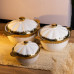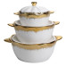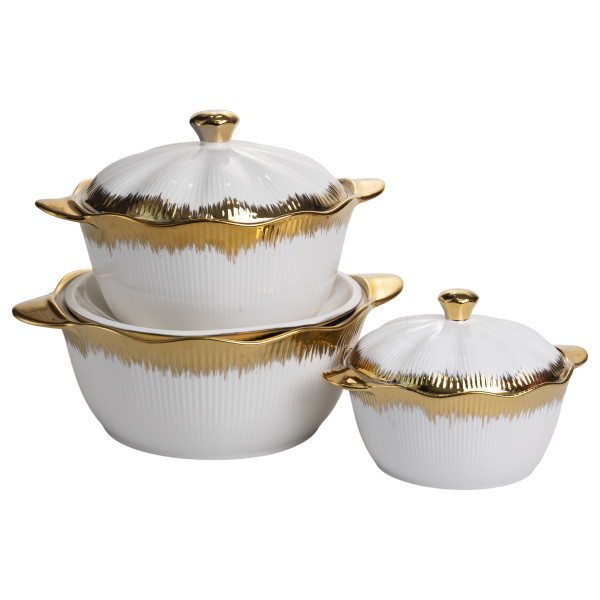 Порцелянові каструлі для супу із золотою облямівкою поєднують у собі витонченість і практичність, підходячи як для щоденного використання, так і для сервірування страв на святковому столі. Золота облямівка виконана за точною гальванічною технологією, що забезпечує стійкість до зношення й зберігає первісний блиск навіть після тривалого користування. Унікальна текстура нитки та геометричний малюнок створюють візуальну глибину, надаючи кожній каструлі індивідуальний характер.
