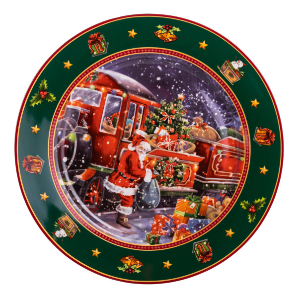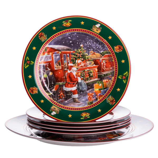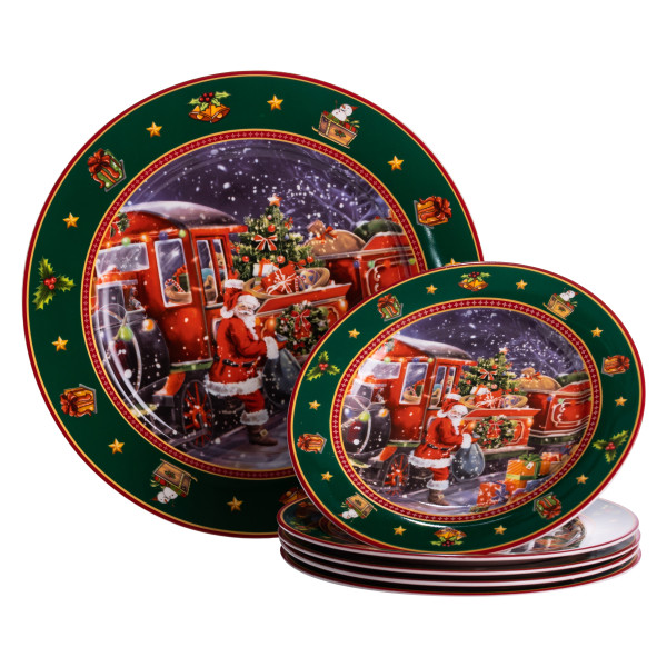 Цей набір тарілок створений, щоб перенести атмосферу новорічного чаклунства прямо на святковий стіл. Яскравий, детально опрацьований малюнок з Санта Клаусом, його казковим експресом та різдвяними подарунками в обрамленні насиченого зеленого борту стане центральним акцентом сервірування.