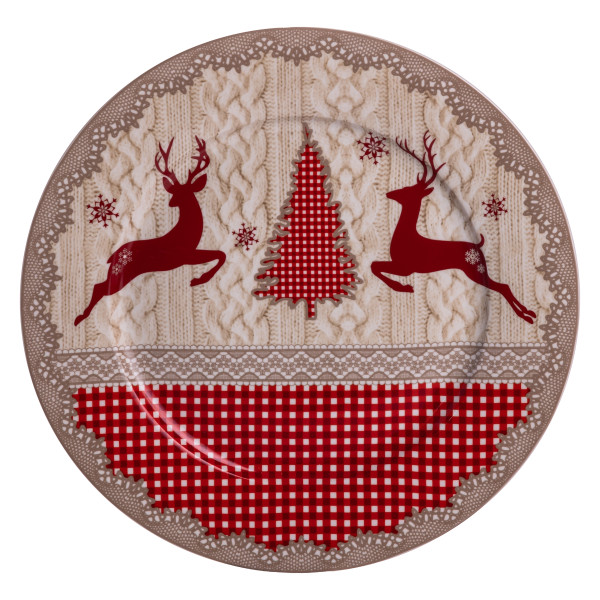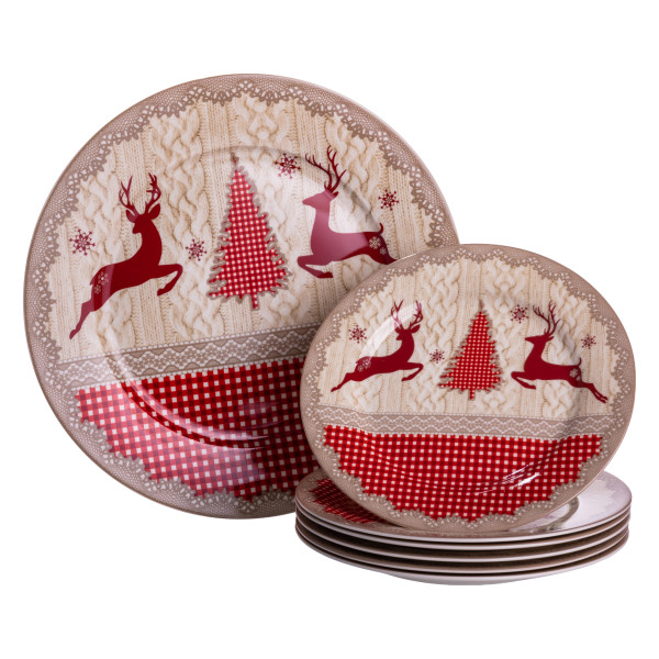 Цей набір тарілок створений для того, щоб створити за святковим столом по-справжньому теплу та затишну атмосферу. Дизайн, що імітує в'язаний зимовий светр, з силуетами оленів та ялинок ідеально підходить для різдвяного та новорічного застілля, та робить тарілки чудовим вибором для декору.