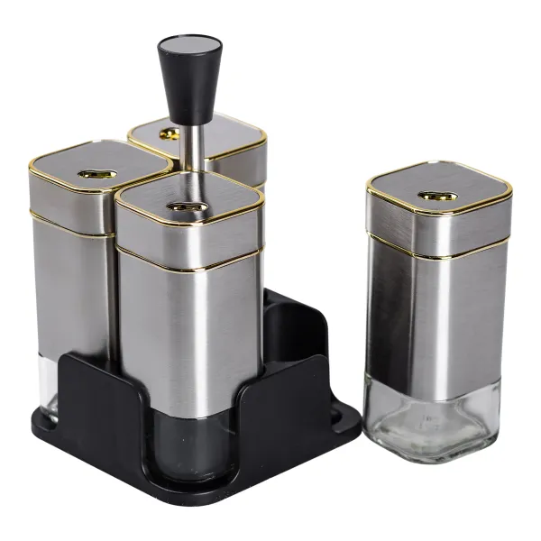 Набір ємностей для спецій на підставці складається з чотирьох скляних баночок об'ємом 120 мл. Прозоре скло дозволяє легко контролювати рівень наповнення, а пластикові кришки забезпечують герметичність, запобігаючи попаданню вологи та збереженню аромату спецій.