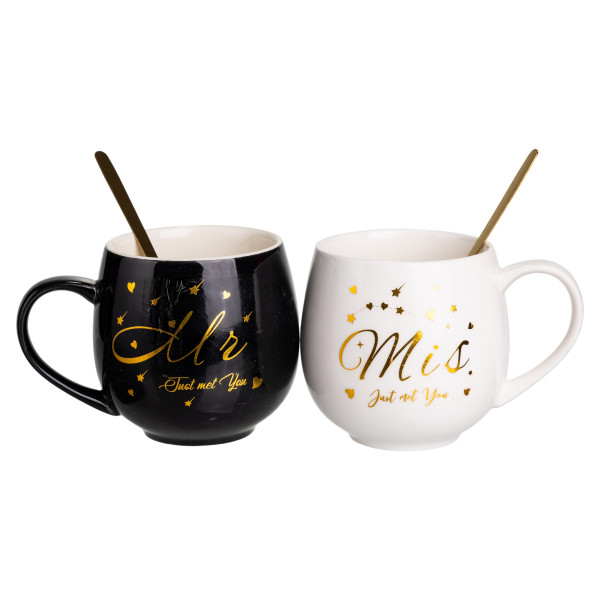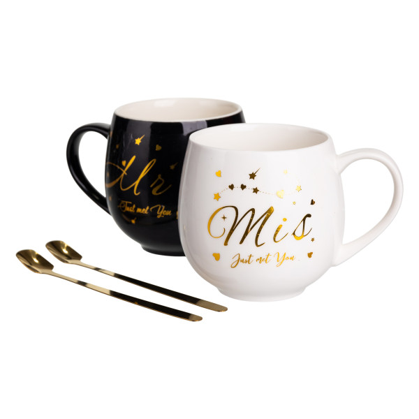 Набір фарфорових чашок Mr & Mis - відмінний подарунок та варіант для повсякденного використання. Класичний контраст чорної та білої кружки забезпечує елегантний і стильний вигляд. Чашки виготовлені з якісного фарфору, приємного на дотик та безпечного для щоденного використання. У набір входять 2 металеві ложечки - ідеально для чаю, кави та гарячого шоколаду.