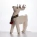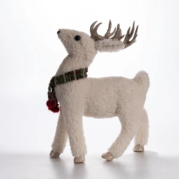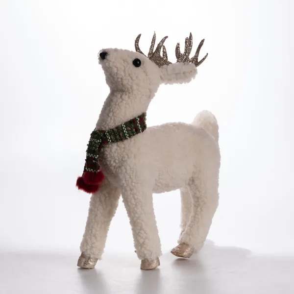 Фігурка оздоблена сріблястими рогами та копитами з блискучим покриттям, що додає легкого святкового ефекту без надмірного блиску. На шиї — текстильний шарф у червоно-зелено-золотій гамі з декоративними китицями, що підкреслює зимову тематику. Матеріал — легкий текстиль, вагою 200 г, що забезпечує зручність у розміщенні та переміщенні.