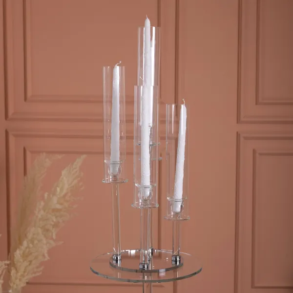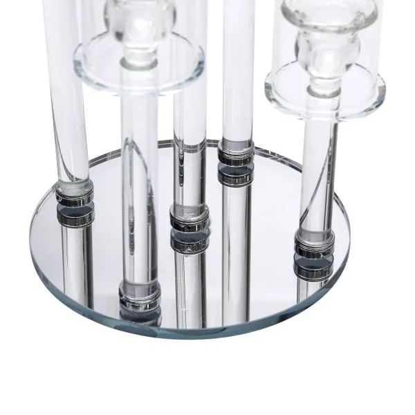 Скляний декоративний підсвічник на 5 свічок складається з п’яти вертикальних циліндричних колб різної висоти, закріплених на круглій основі. У кожній трубці передбачена скляна вставка для встановлення тонкої свічки діаметром до 2 см. Конструкція повністю виготовлена зі скла, що робить її прозорою та візуально легкою.