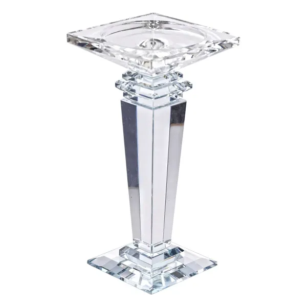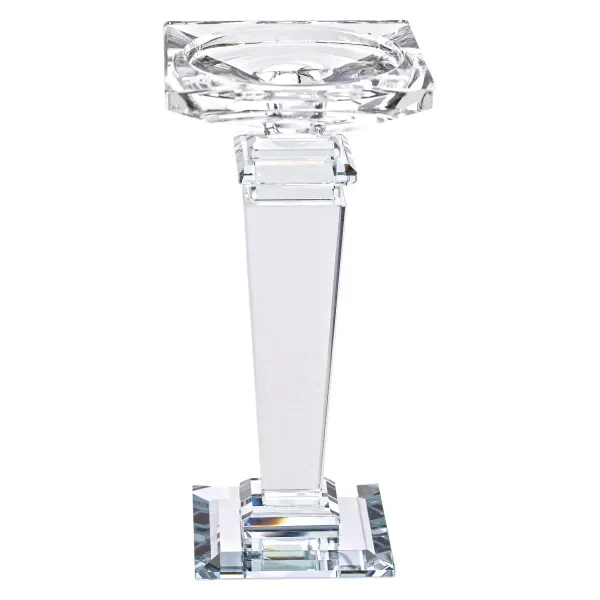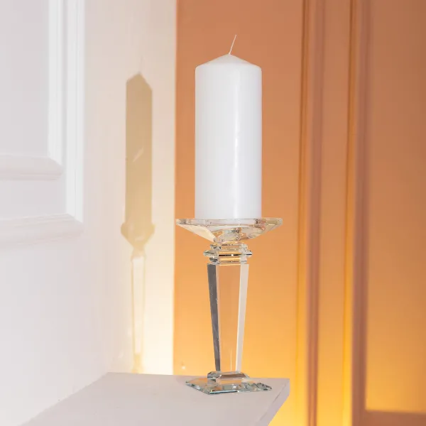 Скляний підсвічник Sylvie Crystal має вертикальну цільну конструкцію з акцентом на прозорість і геометричну чіткість форм. Виріб складається з монолітного стрижня, що плавно переходить у квадратну основу, яка забезпечує стійкість. Тримач під свічку — квадратний, з отвором діаметром 2.5 см, призначений для класичних тонких свічок.