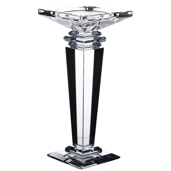 Скляний підсвічник Sylvie Crystal має вертикальну цільну конструкцію з акцентом на прозорість і геометричну чіткість форм. Виріб складається з монолітного стрижня, що плавно переходить у квадратну основу, яка забезпечує стійкість. Тримач під свічку — квадратний, з отвором діаметром 2.5 см, призначений для класичних тонких свічок.