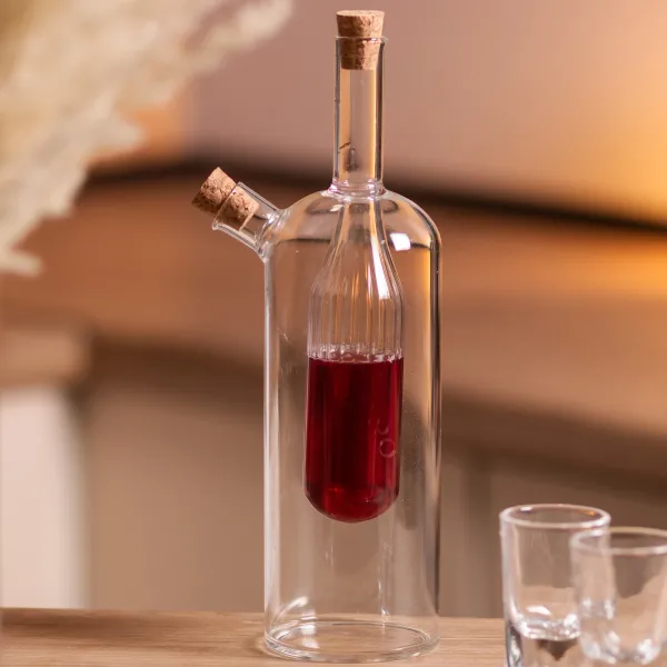 Оригінальна скляна пляшка для олії та оцту - зручний та практичний аксесуар для повсякденного використання. Пляшка виготовлена з якісного боросилікатного скла, не вступає в реакцію із вмістом. Ємність ідеально підходить для зберігання олії, оцту та соєвого соусу, дозволяє зручно дозувати приправи під час приготування їжі або заправки салатів. Відділення надійно закриваються пробками, запобігаючи потраплянню всередину пилу та сторонніх запахів, витіканню продукту.