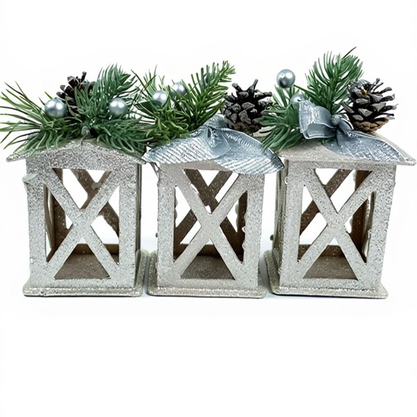 Набір складається з трьох декоративних ліхтариків із дерева, пофарбованих у сріблястий колір з блиском. Кожен ліхтар прикрашений гілочкою штучної хвої, засніженою шишкою, декоративними срібними кульками та блискучими стрічками. Завдяки поєднанню об'ємних елементів і святкового оздоблення, виріб має завершений вигляд і не потребує додаткового декору.