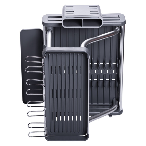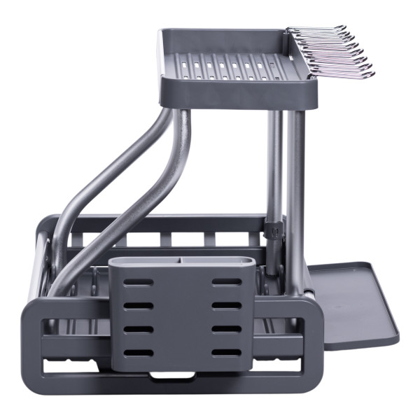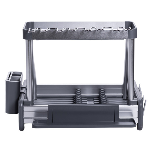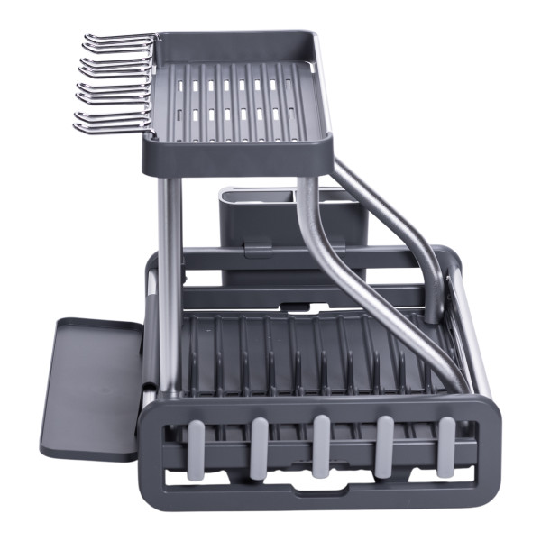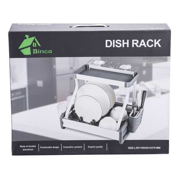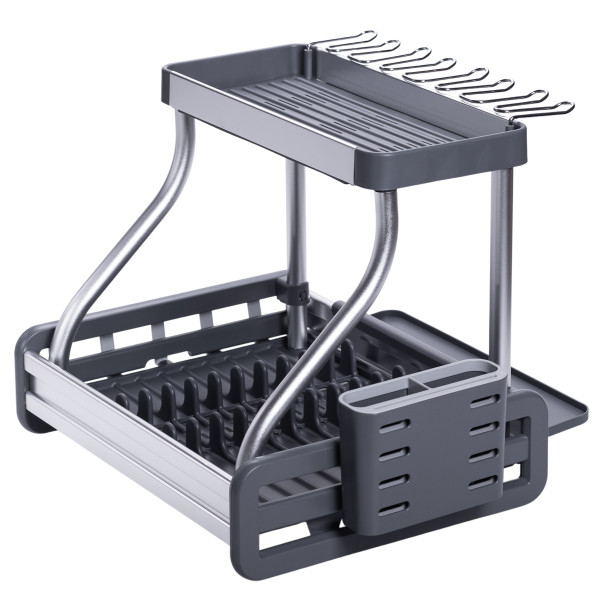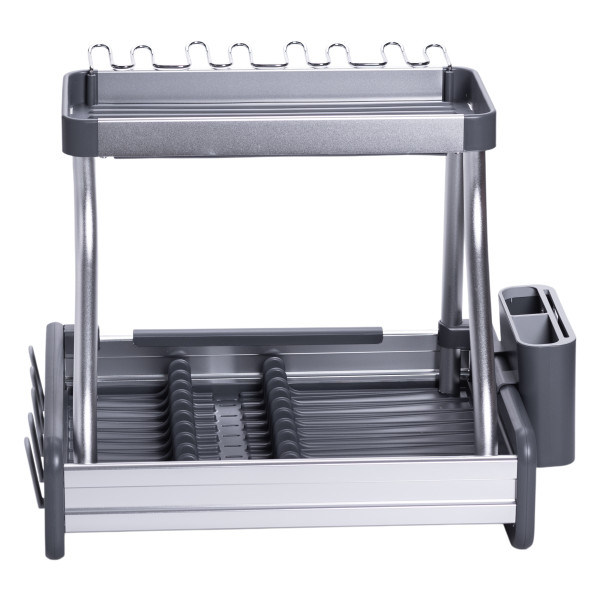 Ця сучасна сушарка для посуду на 2 яруси поєднує в собі міцність алюмінію та практичність пластику. Підійде для невеликої та середньої за розміром кухні, де важливо економити місце та підтримувати порядок.