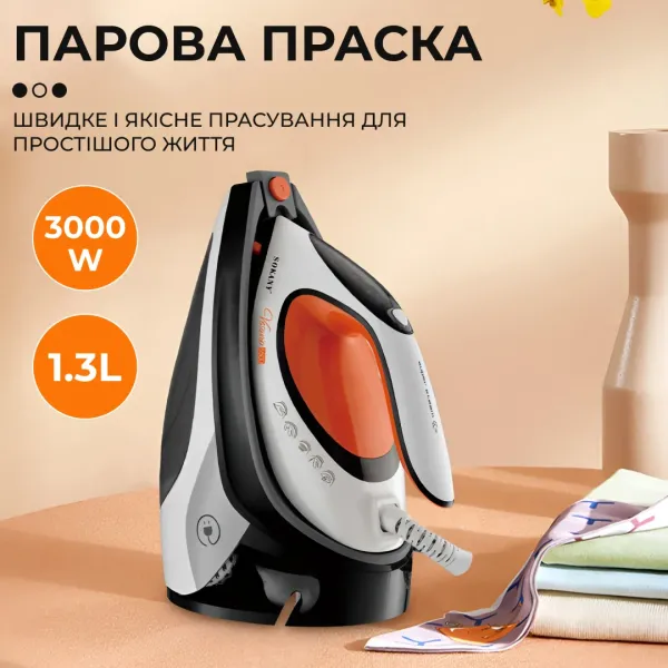 Основні характеристики пристрою включають високу потужність 3000 Вт, що гарантує швидке нагрівання і ефективне прасування, а також великий об'єм парової станції 1,3 л, що забезпечує тривале використання без доливання води. Керамічне покриття підошви забезпечує плавне ковзання по тканині, а система постійної подачі пари робить процес прасування більш рівномірним і ефективним.