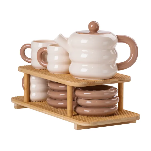 - Комплектация: Чайник, 6 чашек с блюдцами, бамбуковая двухуровневая подставка