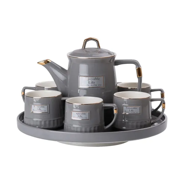 Чайный сервиз «Enjoynbie Life» на 6 персон состоит из 8 предметов и выполнен в стильном сером цвете. В набор входят 6 чашек объемом 300 мл, один чайник вместимостью 1.5 литра и поднос, что обеспечивает удобство в сервировке. Все элементы изготовлены из качественного фарфора, что гарантирует долговечность и приятный эстетический вид.