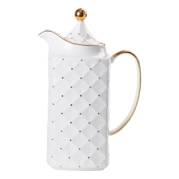 Чайный сервиз фарфоровый на 6 персон - это элегантный набор из 8 предметов, созданный для утонченных чаепитий. В сервиз входит чайник объемом 2 л, шесть чашек объемом 400 мл, и фарфоровый поднос на ножках. Каждый элемент набора выполнен в белом цвете с отделкой золотым ободком, что придает сервизу изысканный вид. Особенностью этого набора являются крышки к чашкам, которые помогают сохранять тепло и обеспечивают дополнительный комфорт во время чаепития.