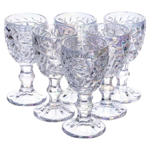 Элегантный набор из 6 рюмок с эффектной текстурой и иризацией - отличный выбор для подачи крепких напитков. Изысканный рисунок на бокале, утончённая ножка и устойчивое основание — идеальное сочетание стиля и практичности.