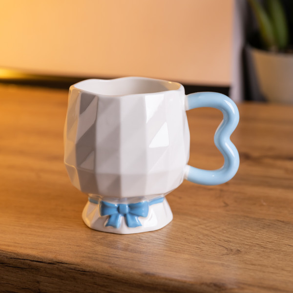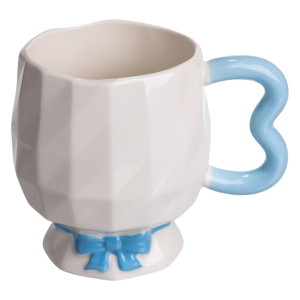 Особенностью конструкции является декоративная основа в виде рельефного банта, расположенного у ножки. Этот элемент интегрирован в корпус чашки и не выступает отдельной частью. Ручка имеет фигурную форму с плавными изгибами, что придает изделию индивидуальность и удобство в удержании. Высота чашки составляет 10 см, что делает ее пригодной для ежедневного использования или как часть тематической сервировки.