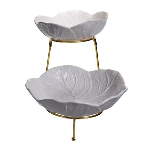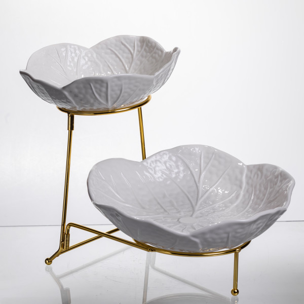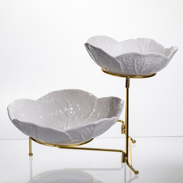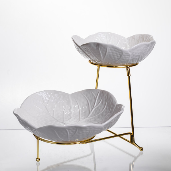 Фруктовница на два яруса выполнена из фарфора и установлена на металлическую подставку золотистого цвета. Ее элегантная форма в виде лепестков создает естественный и гармоничный вид, который подходит как для праздничного стола, так и для ежедневного использования. Благодаря двухуровневой конструкции фруктовница позволяет эффективно разместить различные фрукты, десерты или закуски, экономя место на столе.