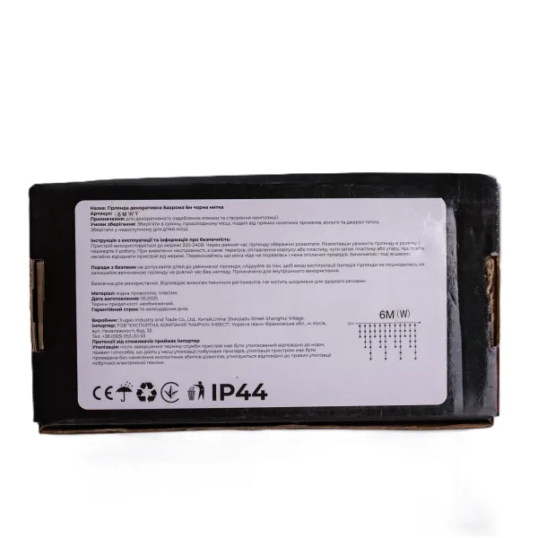 Конструкция содержит 21 подвесную линию разной длины — 65 см, 50 см и 30 см, которые формируют эффект каскада. Расстояние между линиями составляет 29 см, а между отдельными лампочками — 8 см, что обеспечивает плотное сияние без темных промежутков. Расстояние от вилки до первой лампочки — 96 см, что удобно для подключения к розетке без удлинителя.