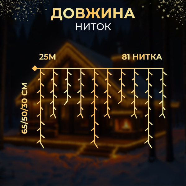 Конструкция содержит 81 подвесную линию разной длины — 65 см, 50 см и 30 см, которые формируют эффект каскада. Расстояние между линиями составляет 30 см, а между отдельными лампочками — 8 см, что обеспечивает плотное сияние без темных промежутков. Расстояние от вилки до первой лампочки — 102 см, что удобно для подключения к розетке.